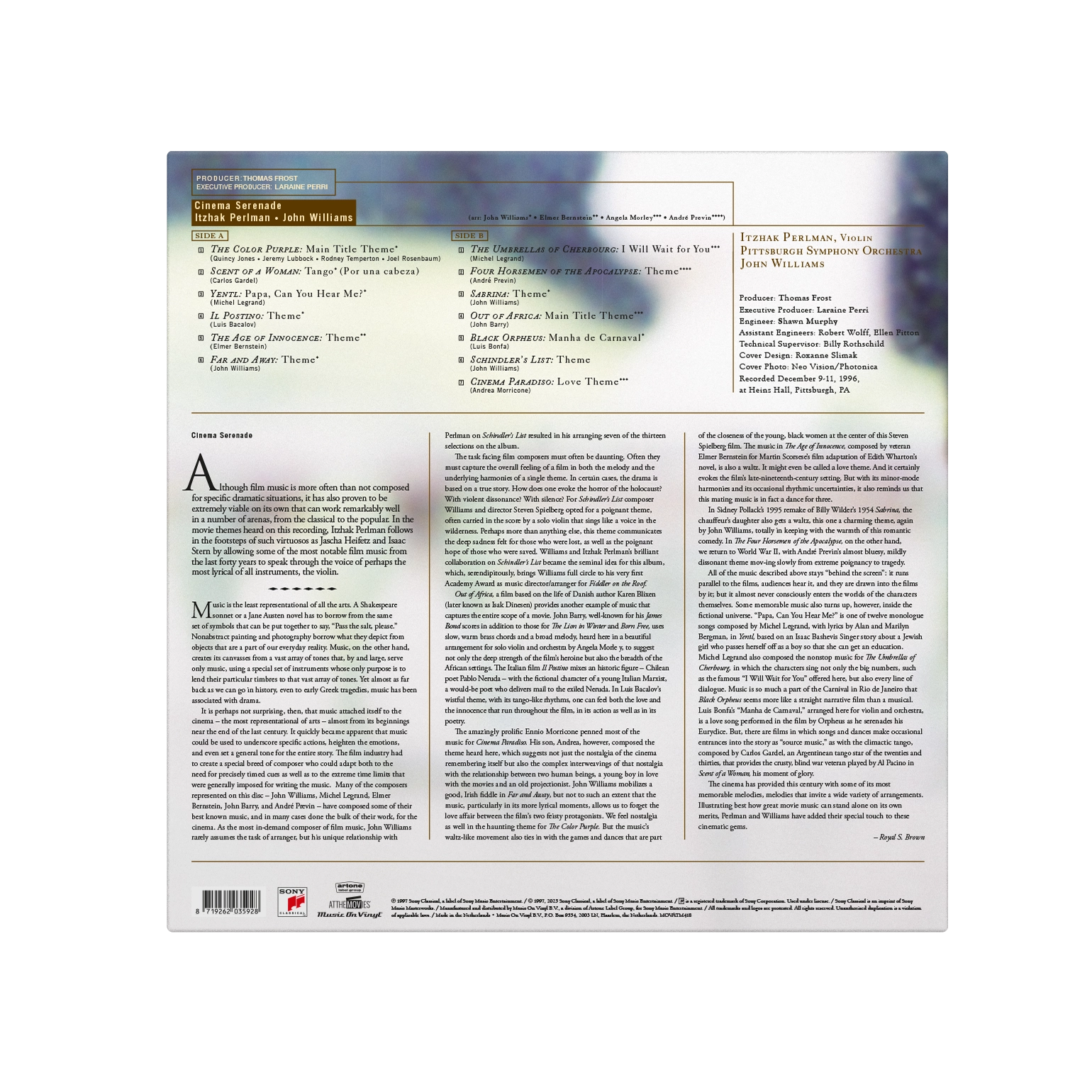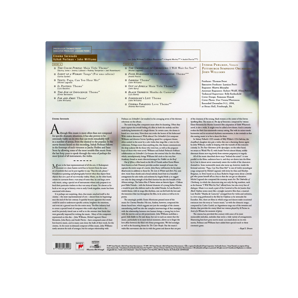 The album presents new arrangements of scores from composers that made a lasting impact on the world of cinema, with a special touch by Williams and Perlman on these cinematic gems. Amongst others, it features work by Michel Legrand, Elmer Bernstein, John Barry, André Previn and John Williams himself. All the work on this album is conducted by Williams and performed by the Pittsburgh Symphony Orchestra. It also features exclusive liner notes from well-known film critic, musicologist and professor Royal S. Brown, presented on the back of the sleeve. Cinema Serenade provides a collection of unique film arrangements, perfect for the film music fan.