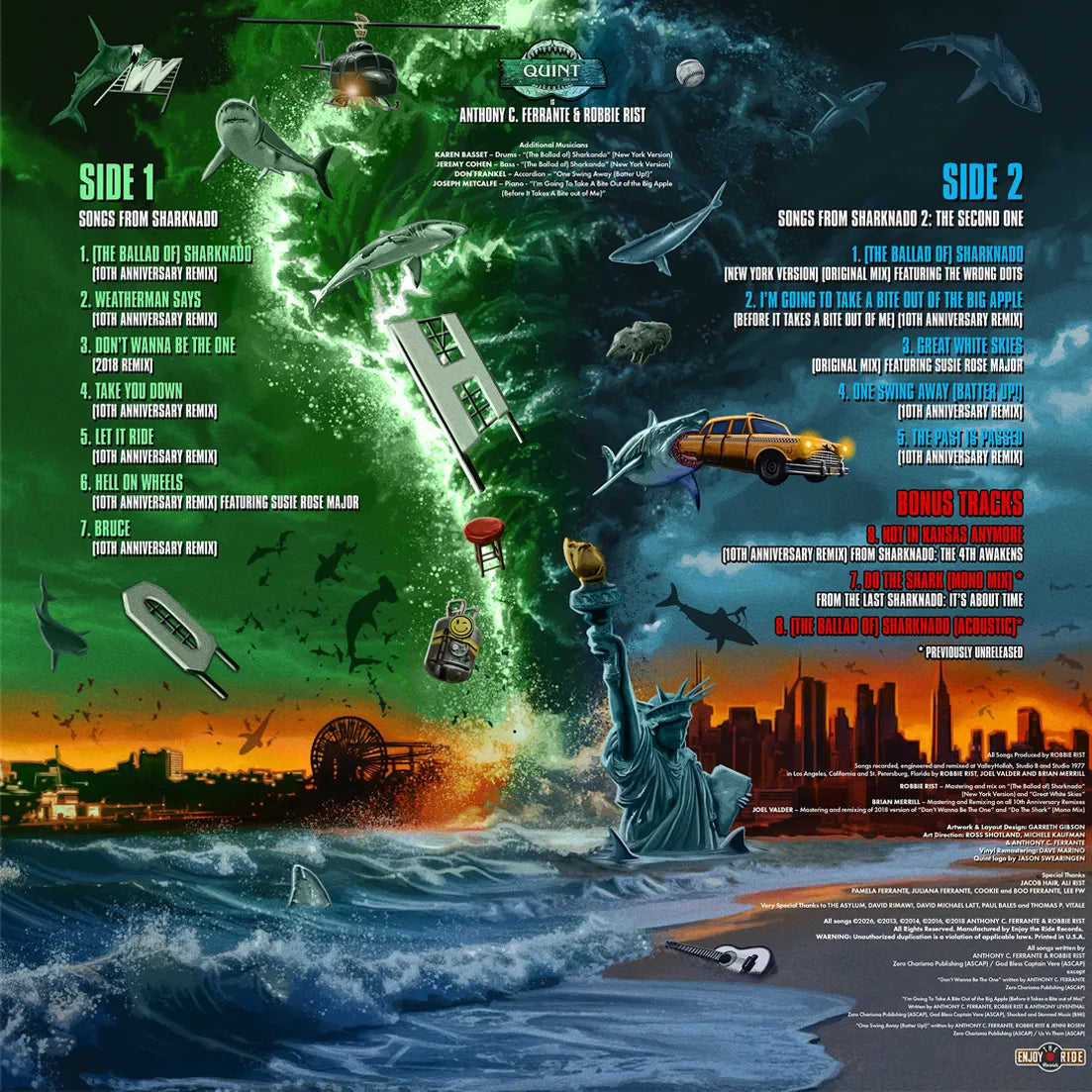 Enjoy The Ride Records, in partnership with filmmaker Anthony C. Ferrante and musician Robbie Rist, proudly presents Songs from Sharknado. Available on any format for the first time, and remastered for vinyl by Dave Marino with remixed tracks by Brian Merill and produced by Robbie Rist, Songs from Sharknado includes songs from the cult classic films Sharknado and Sharknado 2: The Second One, plus previously unreleased bonus tracks and remixes from Sharknado: The 4th Awakens and The  Last Sharknado: It's About Time.