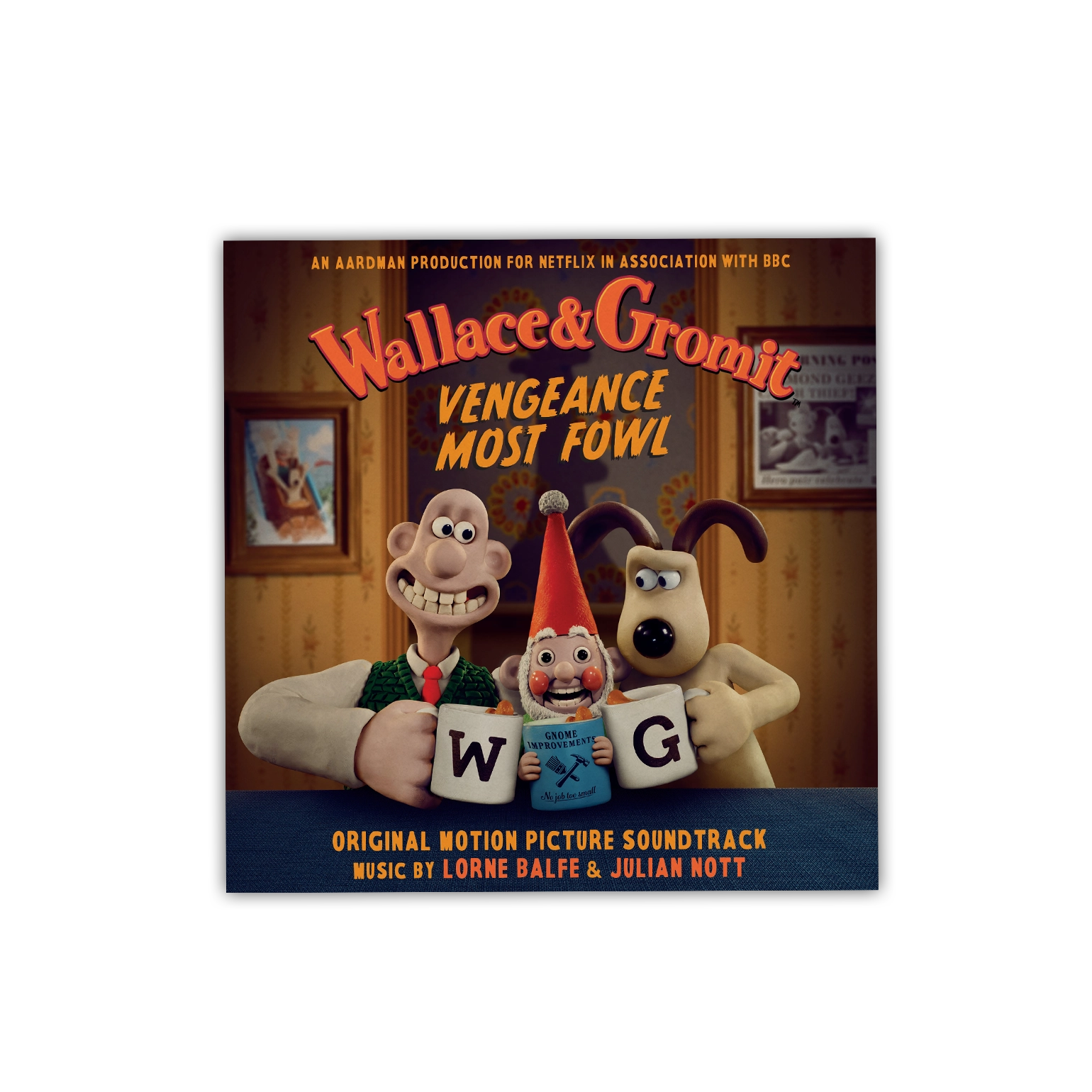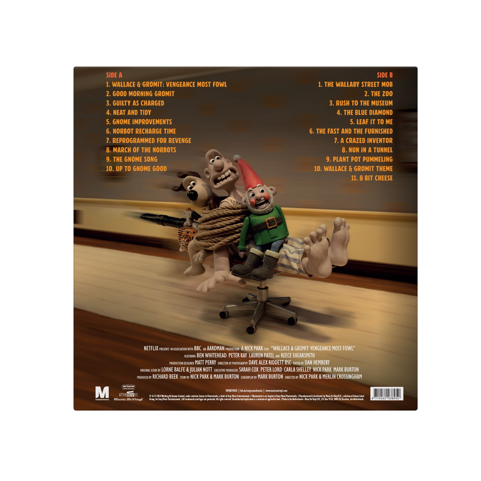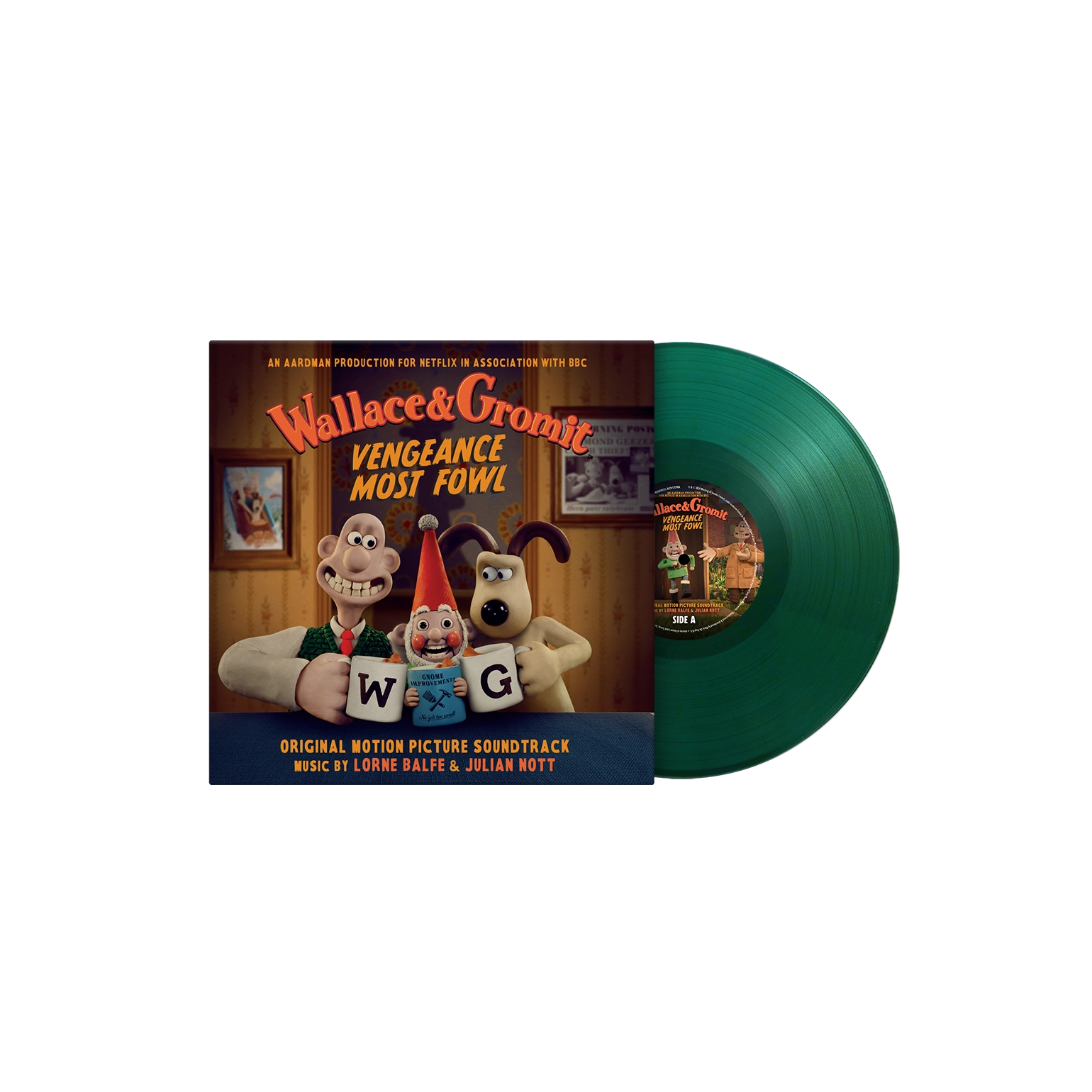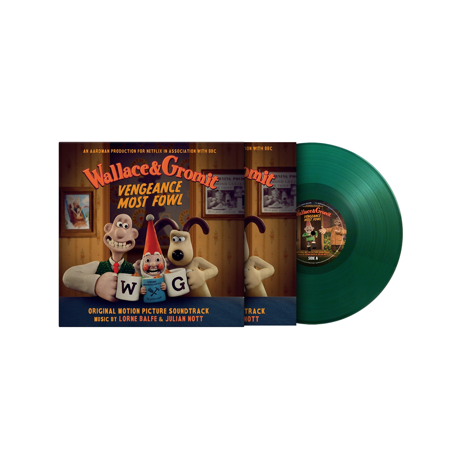 Wallace & Gromit: Vengeance Most Fowl is available as a limited edition of 500 numbered copies on Norbot green coloured vinyl and includes a 4-page booklet with an exclusive drawing by director and creator Nick Park.