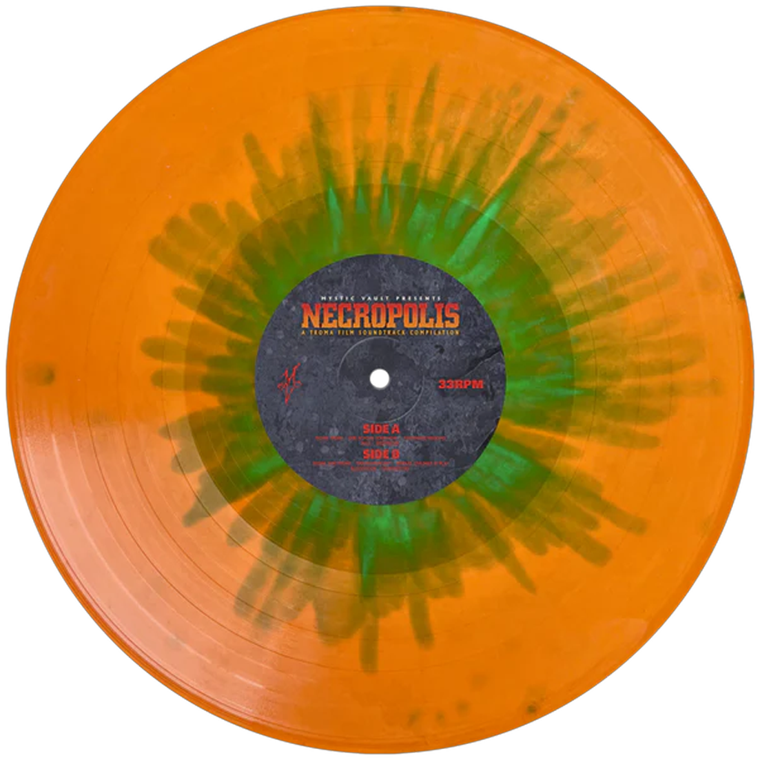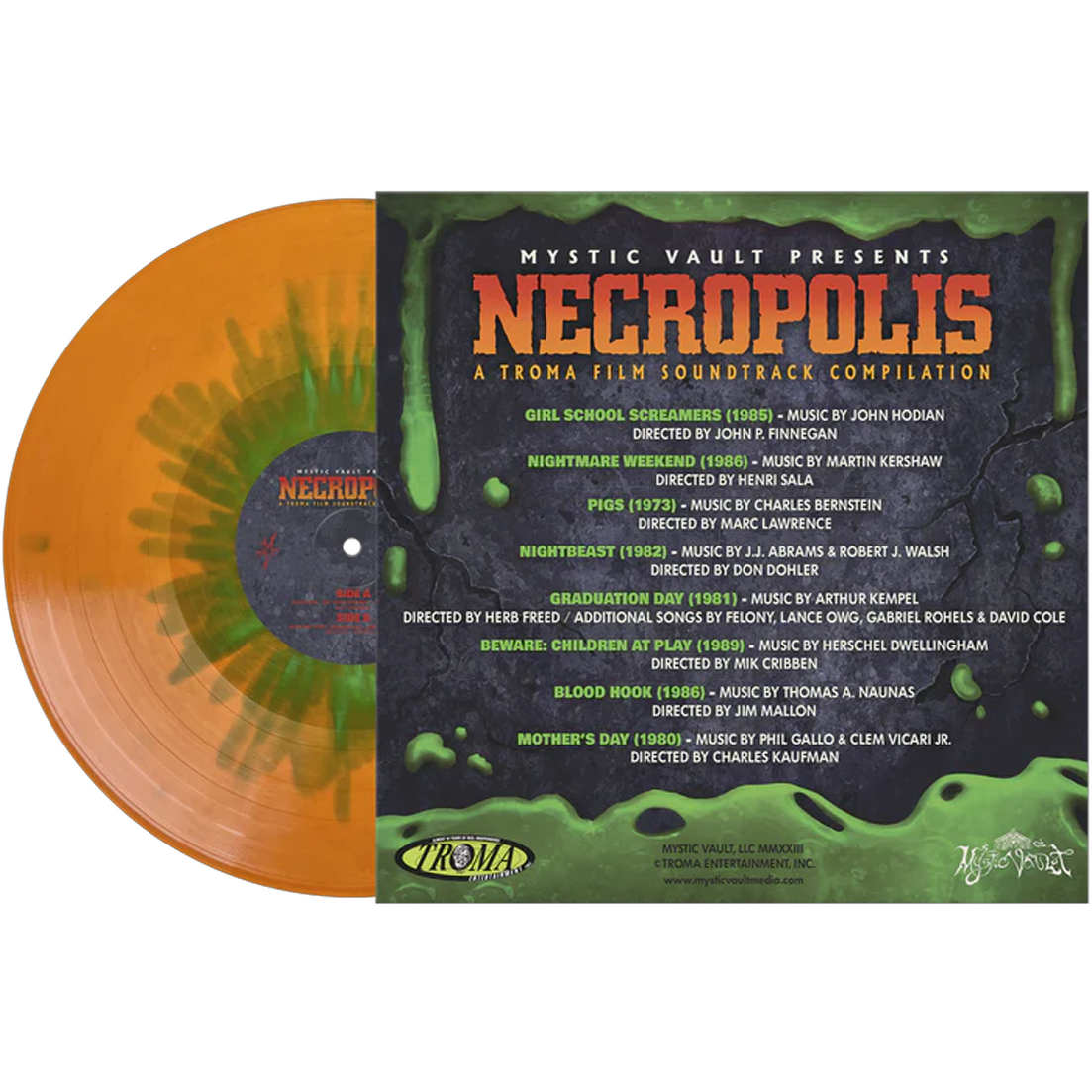 The Necropolis Entertainment Film Soundtrack Compilation LP brings together cult horror and exploitation cinema in one killer collection. Compiled directly from original Troma Entertainment audio tape reels, this soundtrack captures the raw, gritty energy of underground genre filmmaking. Featuring music from films such as Girl School Screamers, Nightmare Weekend, Pigs, Nightbeast, Graduation Day, Beware: Children At Play, Blood Hook, and Mother’s Day, this release is a must for horror soundtrack collectors and cult cinema fans. Pressed on striking 180 gram green and orange transparent splatter vinyl and housed in a deluxe gatefold jacket, Necropolis is both a sonic time capsule and a bold statement piece for any vinyl shelf.