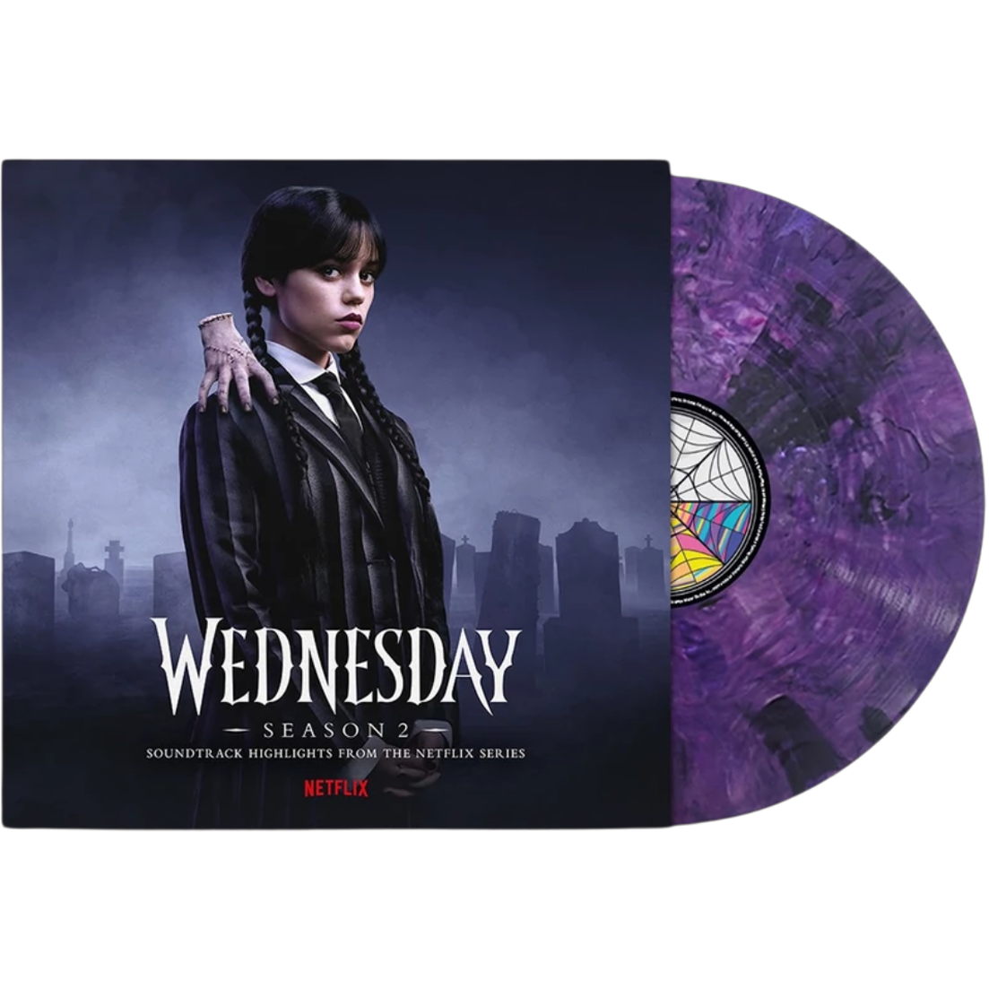 Step into the darkly enchanting world of Wednesday Season 2 with this deluxe vinyl release, capturing the music and atmosphere of Netflix’s hit series. Pressed on purple and black blended transparent vinyl, the album features a stunning spot-glossed cover, custom labels, printed vinyl pockets, a lyric insert, and a collectible poster. The soundtrack blends iconic needle drops, Wednesday’s own haunting cello performances, and evocative score compositions by Emmy-nominated composer Chris Bacon. Highlights include “Bad Moon Rising” from the unforgettable campfire scene, “Zombie” from the asylum breakout, and Bella Poarch’s striking covers of “Zombie” and “Don’t Fear the Reaper.” Also included are powerful score cues such as “Raven Pyre,” “Tale of the Skull Tree,” and “Return to Nevermore.” This collector’s edition is the ultimate companion for fans of the Addams Family’s most beloved daughter.